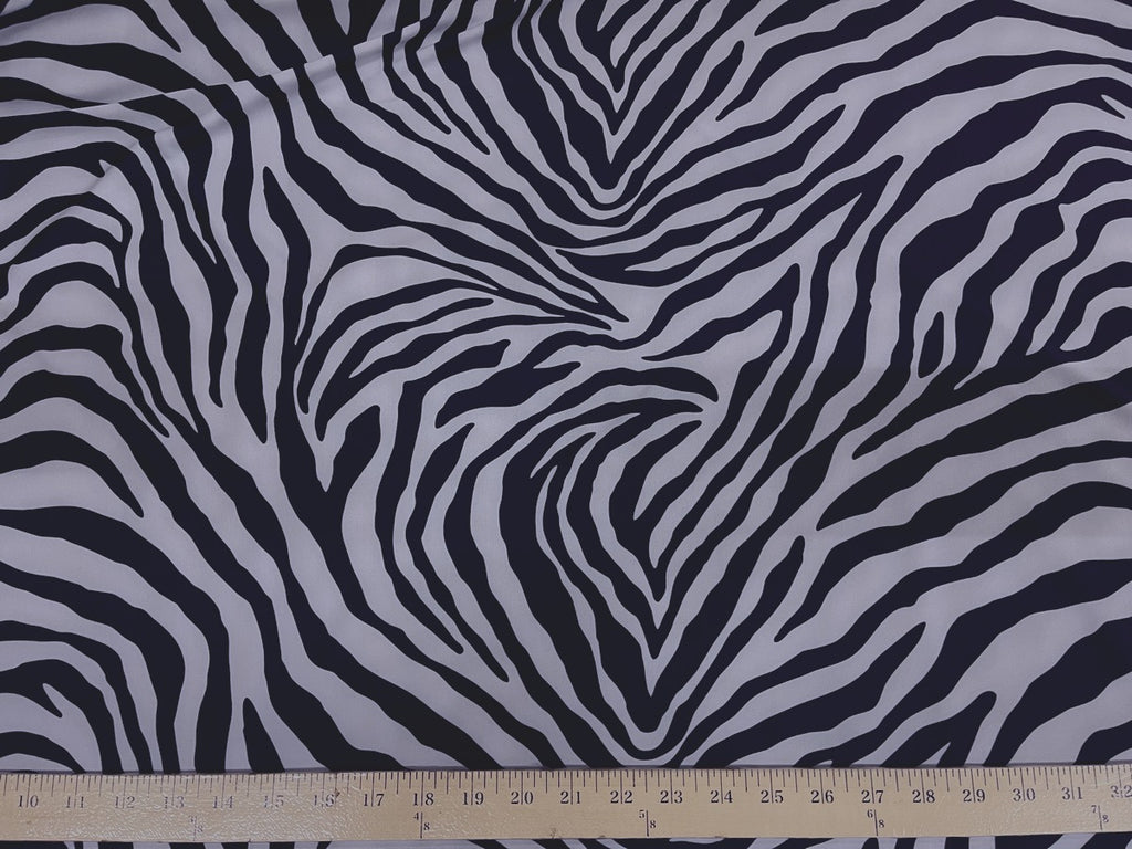 82% Nylon, 18% Spandex/Lycra. 4 way stretch spandex. Great for swim suits and dance outfits. Approximately, 100% stretch in the length and width. Zebra stripes measure approximately 1/4 to 1 inch wide. Approximately 6 ounces per yard. 54-56 inches wide. Machine washable. Colors may vary due to differences in computer screen settings.